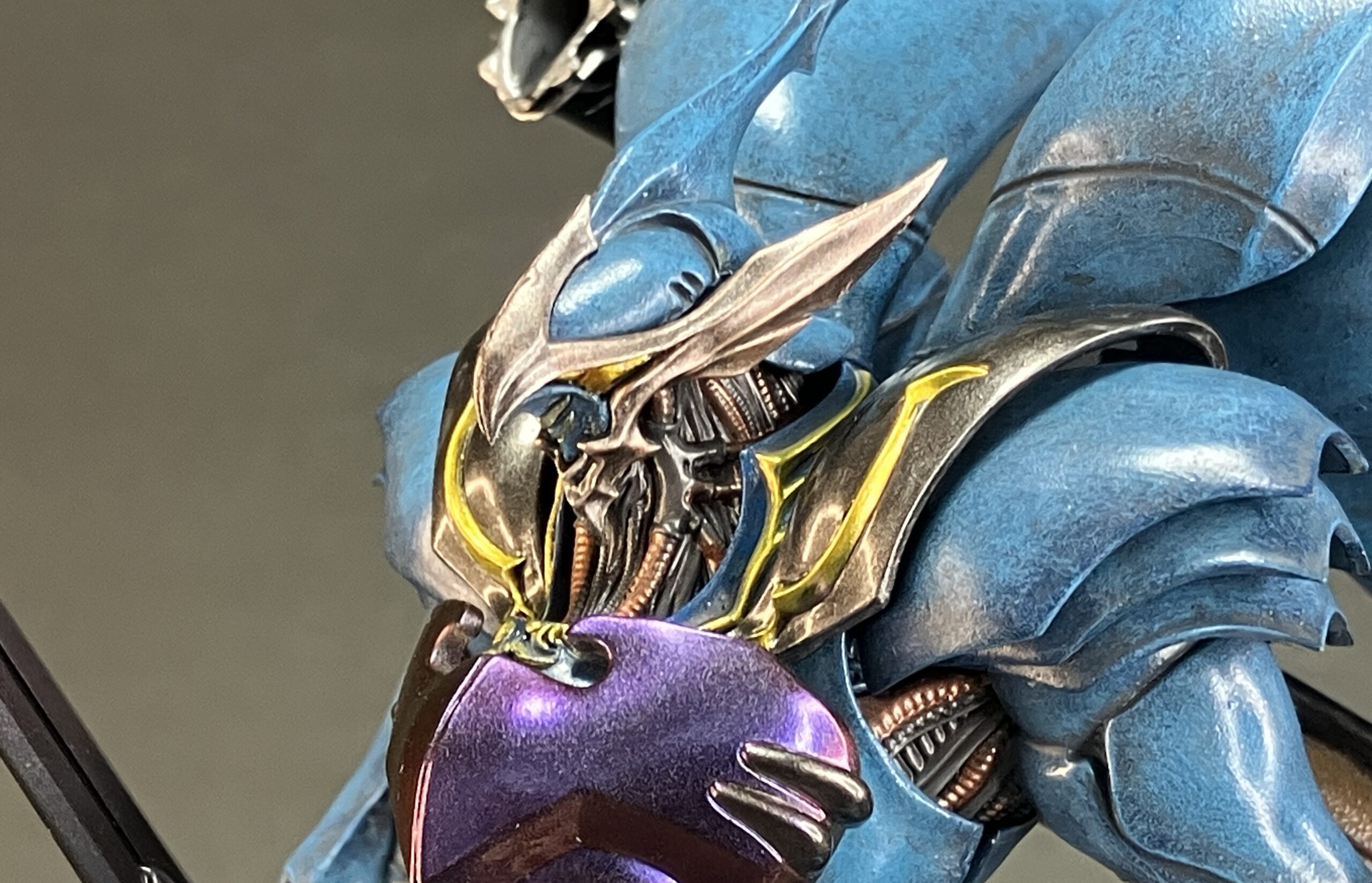 シルバ―は生物的な装甲の中に金属的な装甲がアクセントになるかと思い入れました。膝にも入れようか迷いましたが、くどくなりそうなので止めました。